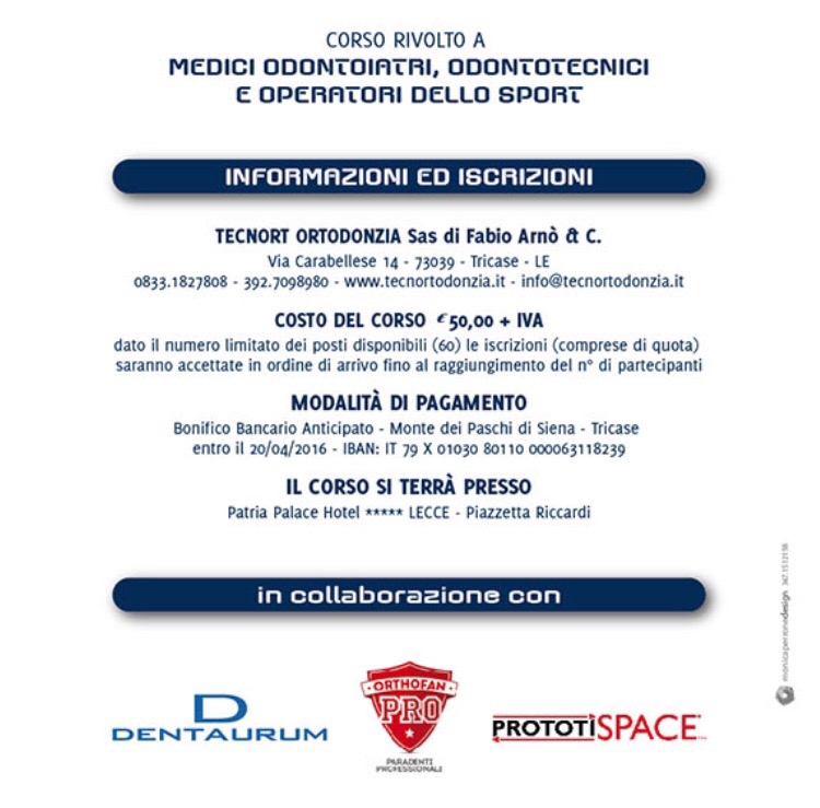 Sabato 30 Aprile 2016, presso il Patria Palace, si terrà un corso teorico sull’odontoiatria e sport.