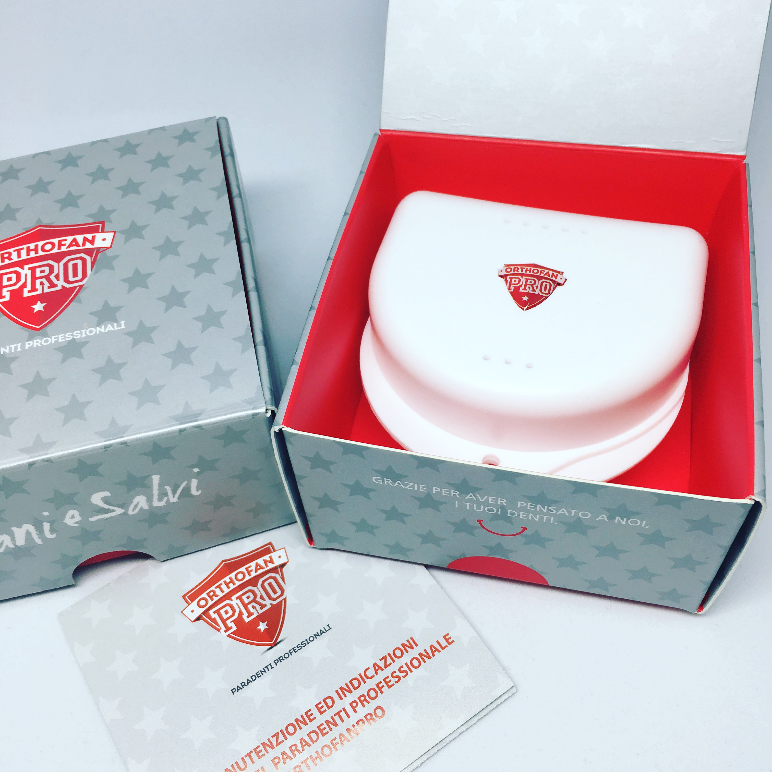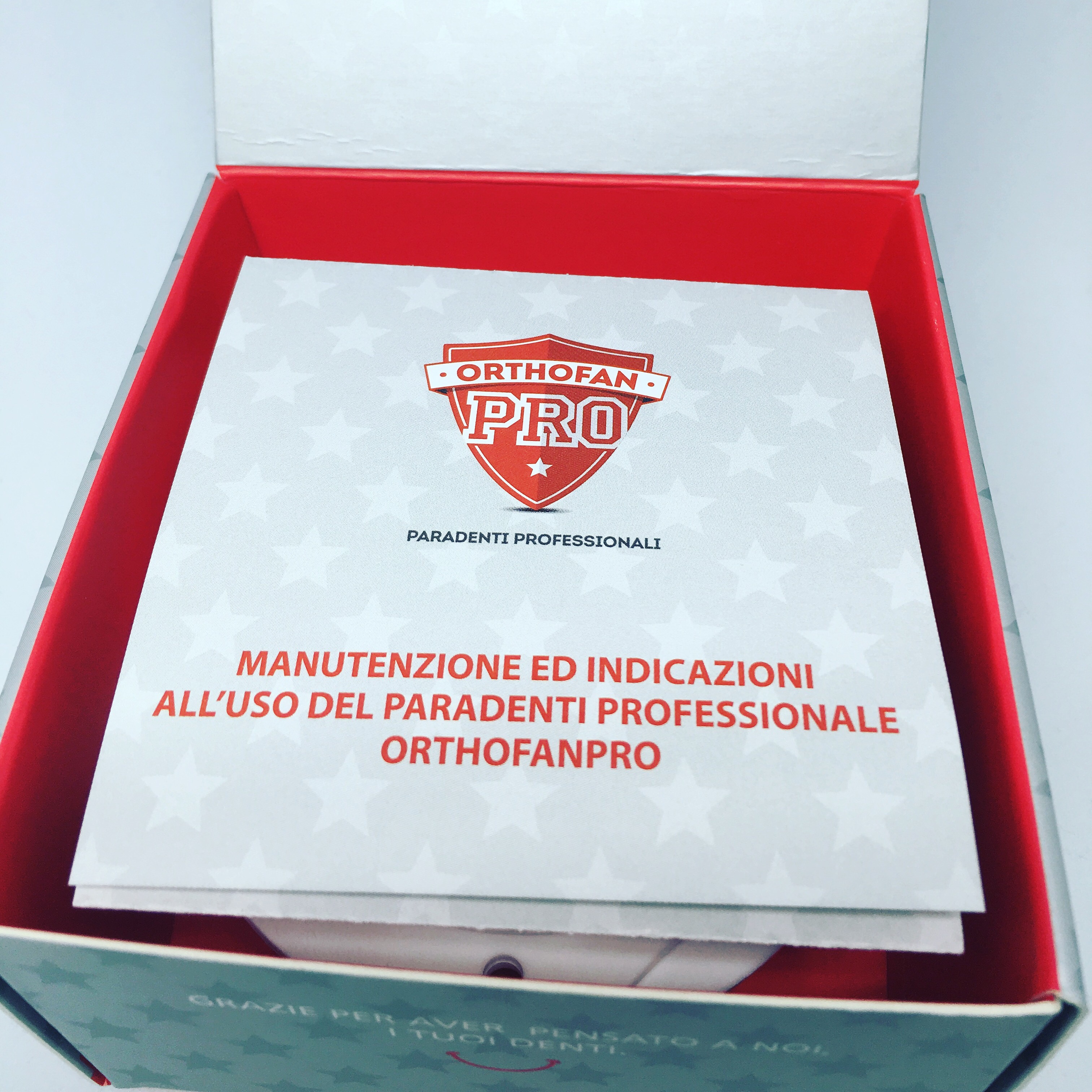 Ovviamente da tutto questo, non poteva non nascere una specifica linea che prevedesse una scatola in cartone pregiato che L’Odontoiatria può consegnare direttamente all’atleta, con all’interno il paradenti professionale personalizzato, un box in plastica per contenerlo e le istruzioni di manutenzione e di indicazioni per il paradenti OrthofanPro.